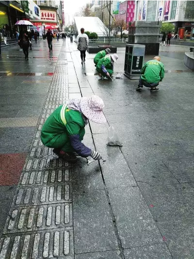 “這樣一直彎腰鏟口香糖要比掃地累得多,一條街走過來已經(jīng)累得直不起腰了,一整天下來我們要清理6斤左右的口香糖呢。”54歲的保潔徐大姐說,她在這里當保潔員已經(jīng)14年,年年會進行口香糖集中鏟除行動,可14年來,步行街上的口香糖卻永遠鏟不完,不知道什么時候,原本鏟除干凈、清洗干凈的地面,又會黏上口香糖。冬天還好,氣溫低,口香糖被凍硬,一鏟子下去就能清除?墒堑搅讼奶欤瑲鉁厣,口香糖軟化后很難清理。