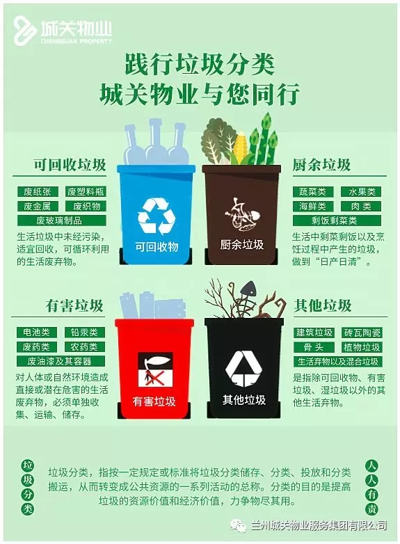 為有效推進城關(guān)物業(yè)所轄小區(qū)垃圾分類工作的有序開展,先后在各小區(qū)購置新型四色分類垃圾桶(包括可回收物、易腐垃圾、有害垃圾和其他垃圾),配備垃圾棚,集中打造生活垃圾分類投放點,方便業(yè)主更好地分類投放。